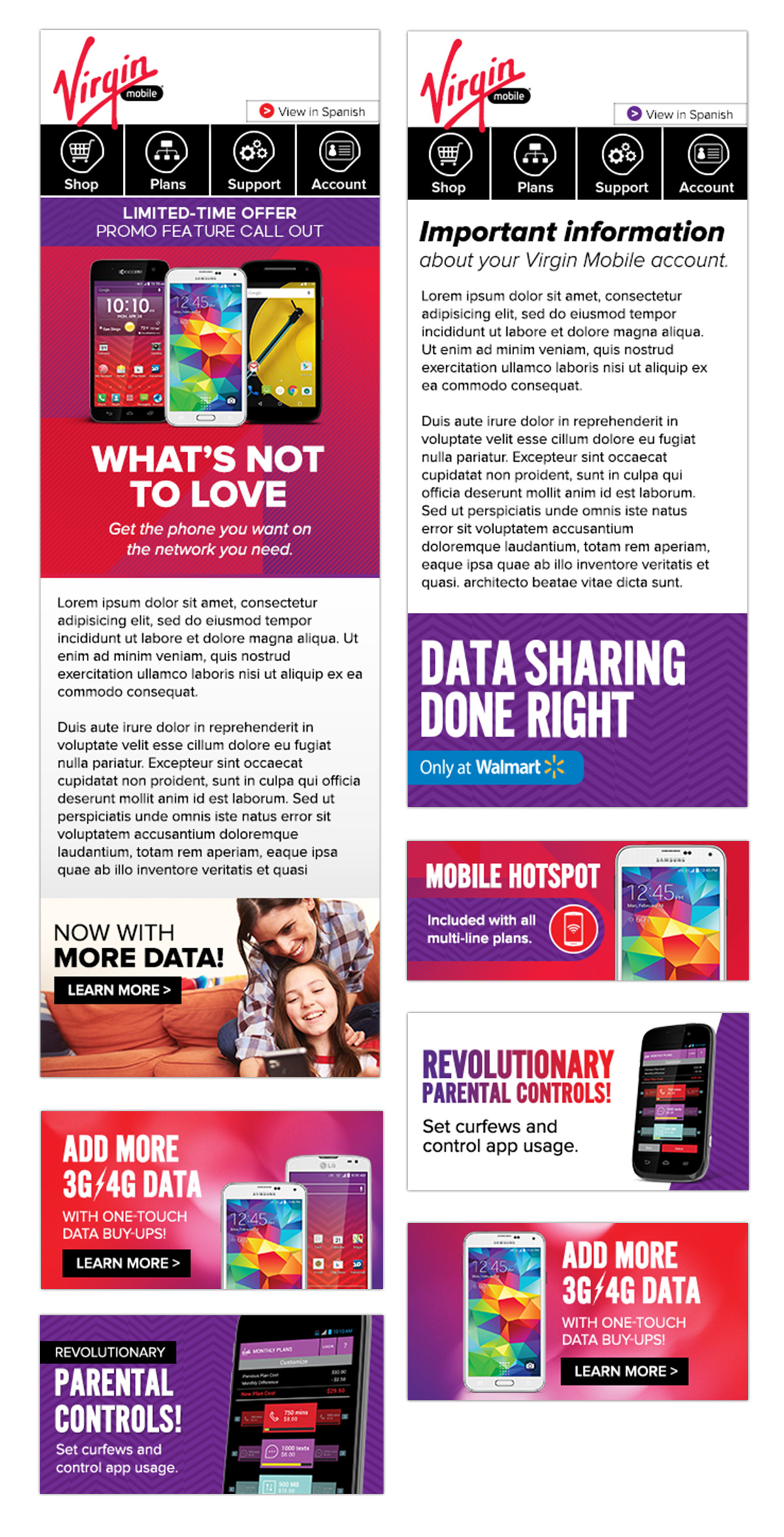 A selection of different designs done for Sprint Prepaid's brand Virgin Mobile. The main goal of this project was to really focus on Email Best Practices. All work was done while I was working as an Art Director at the Ad Agency Callahan Creek.